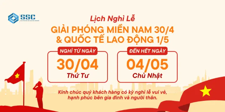 Nhân dịp kỷ niệm Ngày Giải phóng miền Nam, thống nhất đất nước (30/4/1975 - 30/4/2025) và kỷ niệm ngày Quốc tế Lao động (01/5/1886 - 01/5/2025), Công ty Cổ phần Giải pháp phần mềm SSC kính chúc Quý Khách hàng, Quý Đối tác cùng toàn thể nhân viên SSC có kỳ nghỉ lễ vui vẻ, an toàn.